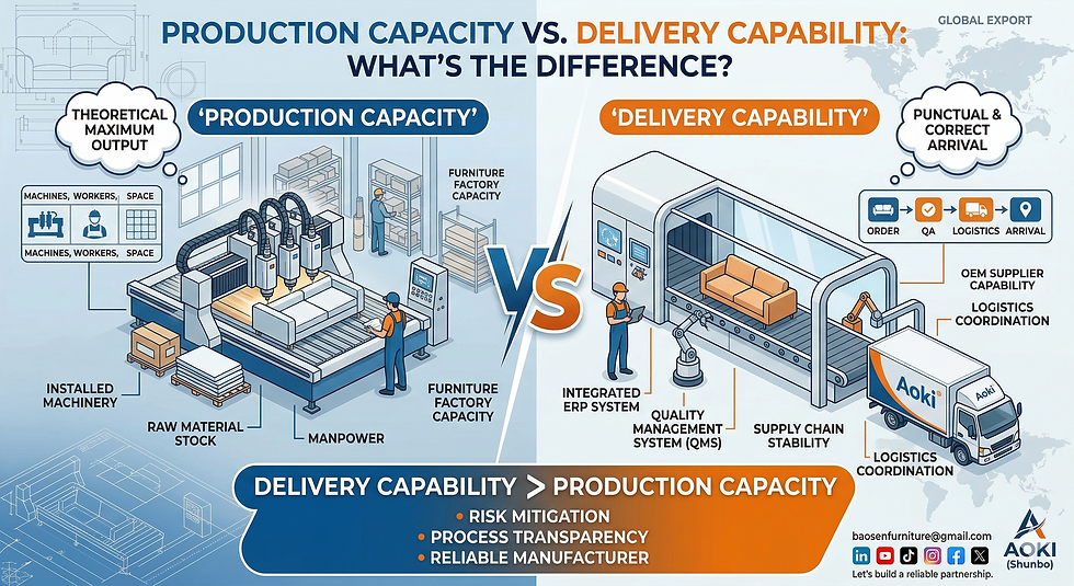 In der globalen Möbelbeschaffung werben Fabriken oft mit beeindruckenden Zahlen: „500 Container pro Monat“ oder „100.000 Quadratmeter Produktionsfläche“. Doch für einen deutschen Importeur ist die Produktionskapazität (was eine Fabrik herstellen könnte) zweitrangig gegenüber der Lieferfähigkeit (was tatsächlich pünktlich und in korrekter Qualität am Bestimmungsort ankommt).